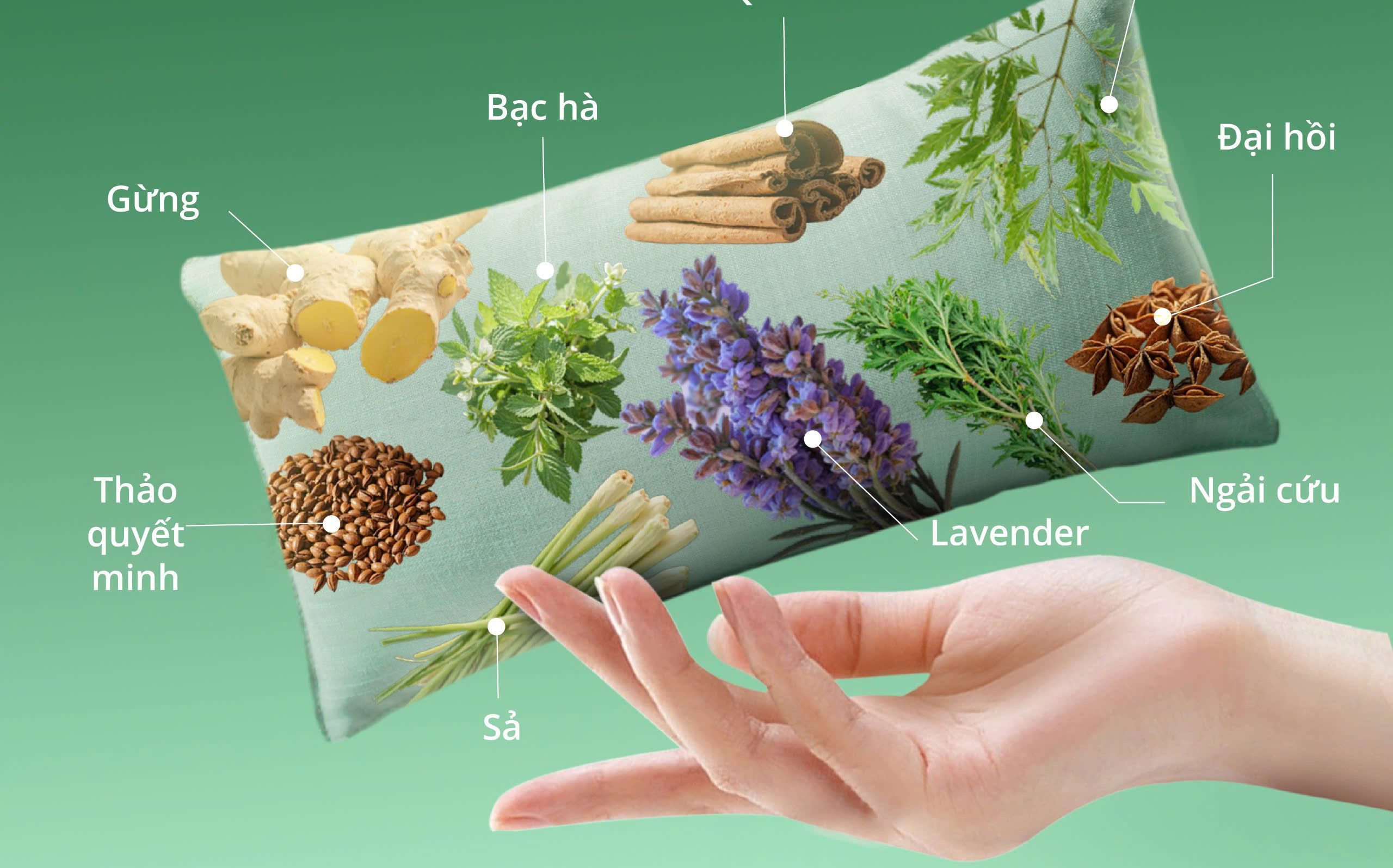 Mỗi chiếc gối HerbViet là sự hòa quyện của 9 loại thảo dược quý: Đinh lăng, Bạc hà, Đại hồi, Thảo quyết minh, Sả, Quế chi, Gừng, Ngải cứu và Lavender.