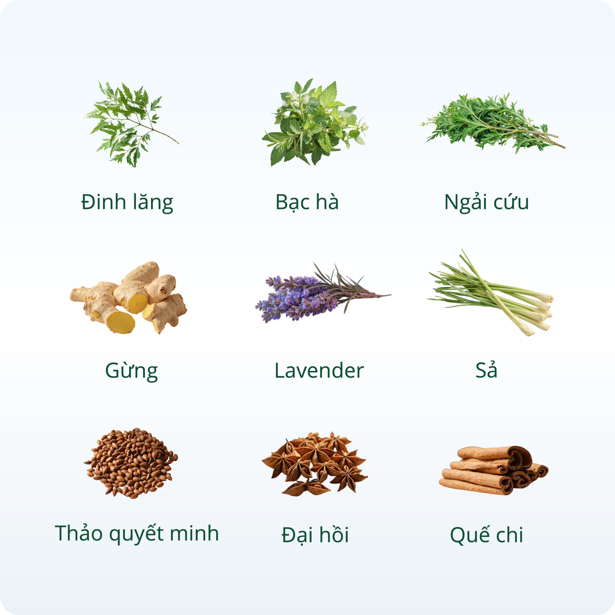 Thành phần gồm 9 loại thảo dược truyền thống như ngải cứu, gừng, quế chi, đinh lăng… giúp giảm đau nhức, thư giãn cơ, tăng tuần hoàn máu và hỗ trợ giấc ngủ sâu. Dễ sử dụng, tiện lợi, chỉ cần hâm nóng và tận hưởng liệu pháp thảo mộc ngay tại nhà.