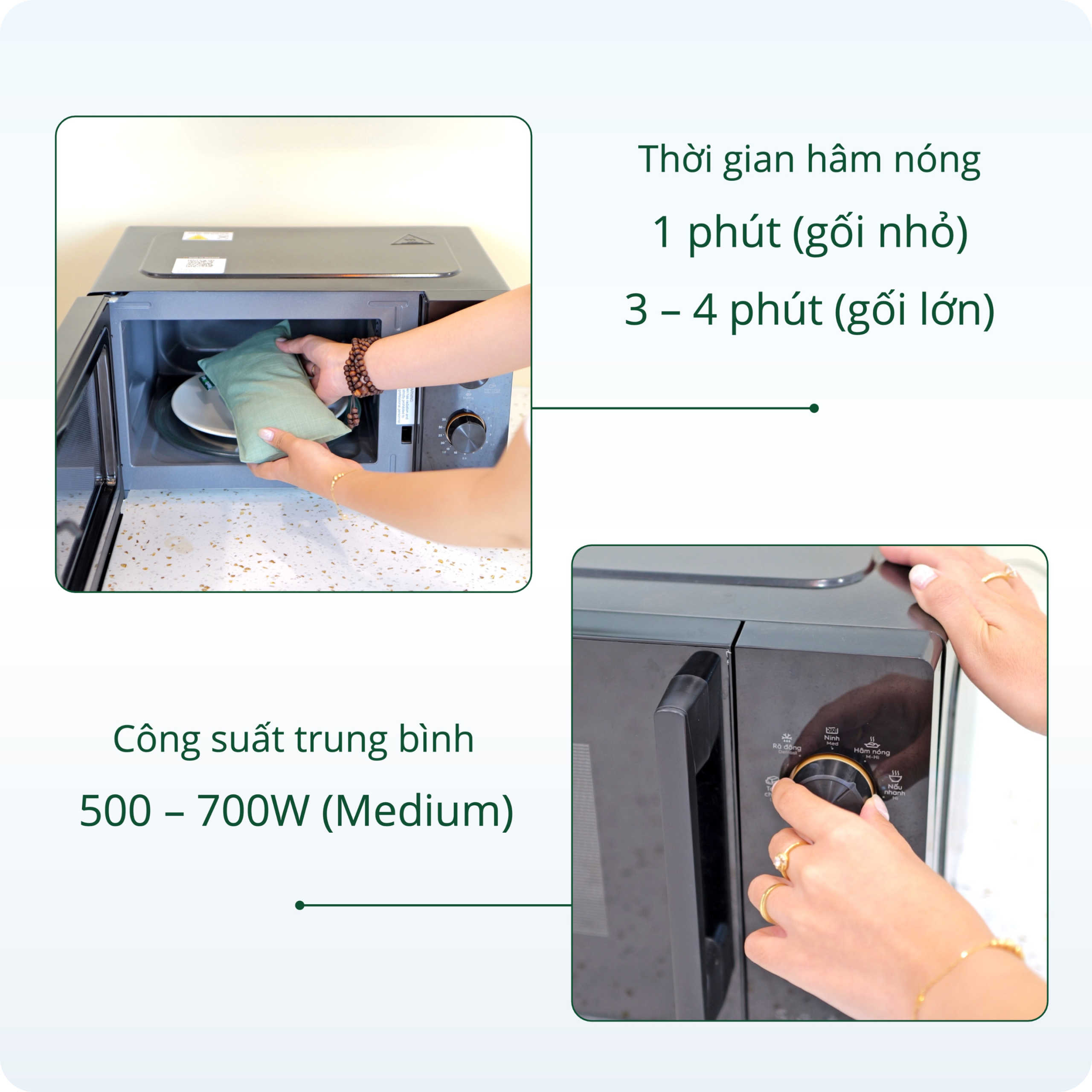 - Cho gối vào lò vi sóng ở mức công suất trung bình (500–700W) trong 1 phút (gối nhỏ) hoặc 3–4 phút (gối lớn).
