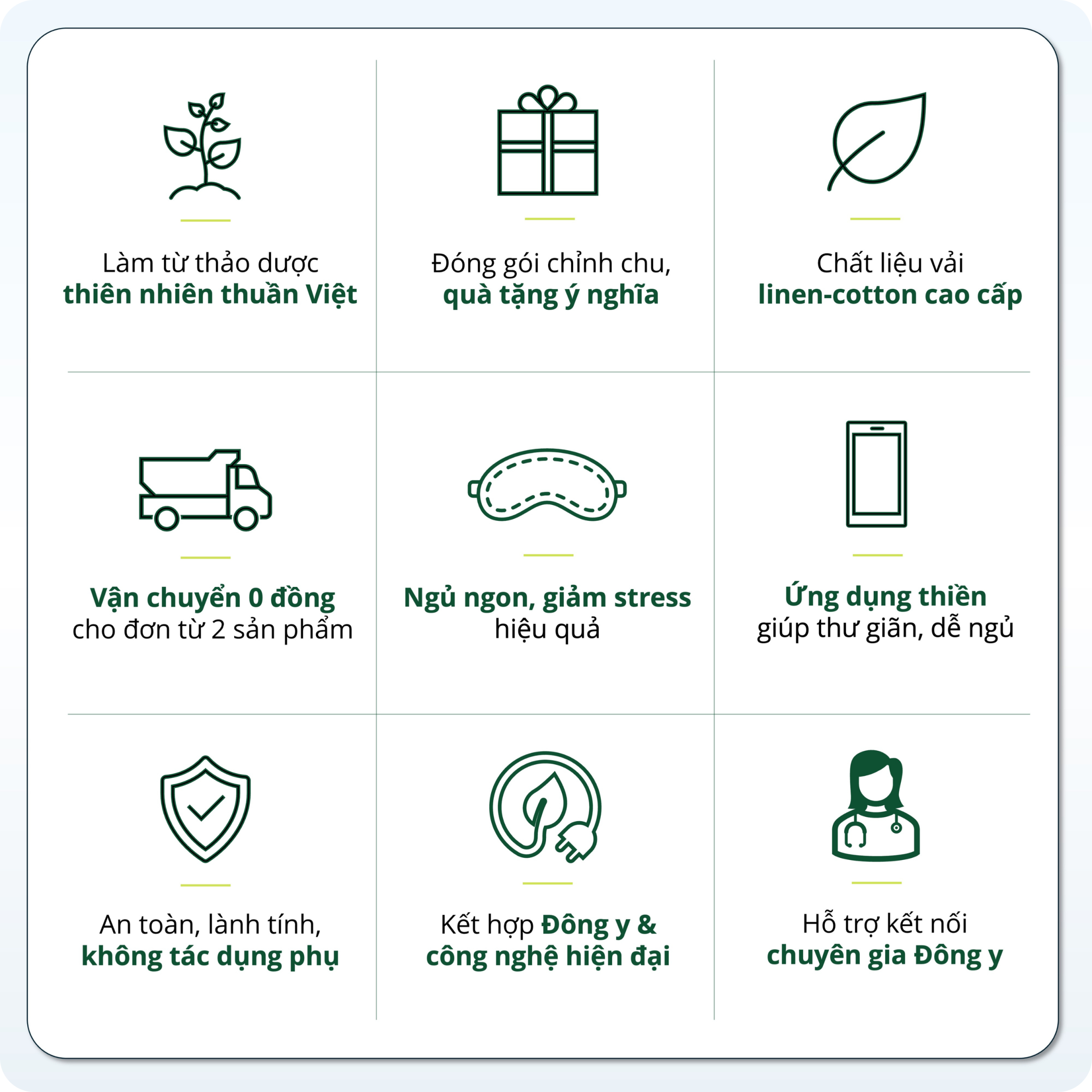 Nhẹ nhàng ôm sát vùng mắt, giúp thư giãn, giảm căng thẳng và hỗ trợ giấc ngủ sâu. Chứa 9 loại thảo dược thuần Việt tỏa hương dịu nhẹ, mang lại cảm giác dễ chịu và an yên.